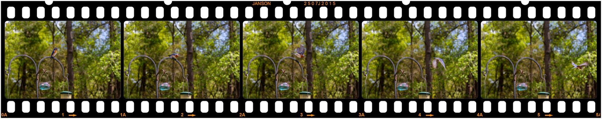 Six of a total of 18 individual shots of an eastern bluebird taking flight. The first shot serves as the base for the composite photo; from all the others, only the bird was cropped out and inserted (All photos: ISO 1,000 – 100 mm – f/5.6 – 1/4,000 sec).