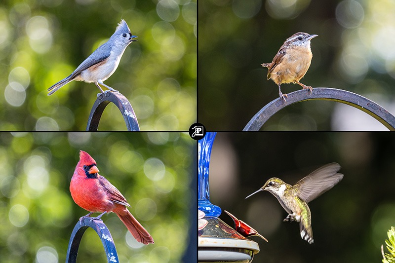 From top left to bottom right: tufted titmouse, Carolina wren, cardinal, ruby-throated hummingbird.