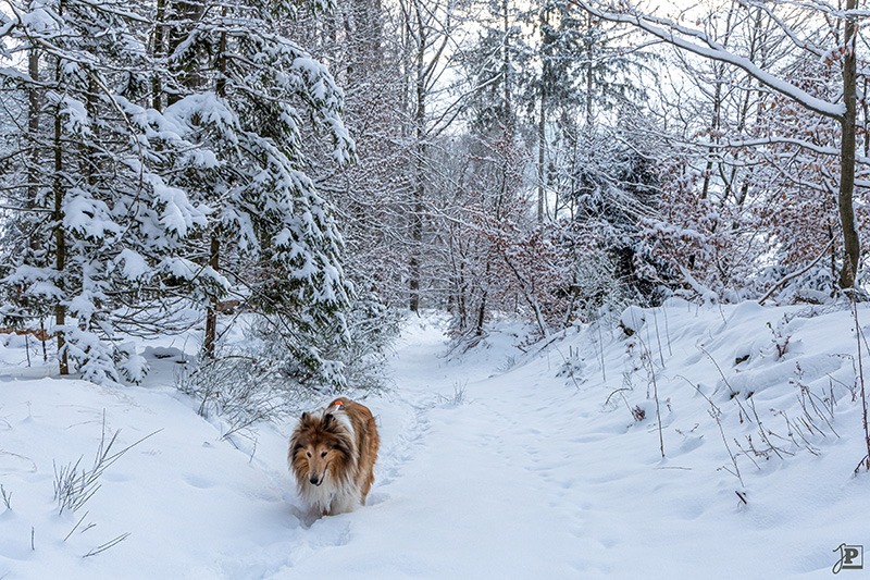 When taking a morning walk in a forest covered in deep snow, having the right companion is, of course, essential.